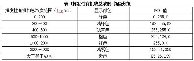 4.监测工作完成后,需提供走航路径上的挥发性有机物总量浓度分布图,总量浓度由不同颜色区分。在主要污染点位需标注主要污染物名称及定量结果、总量浓度、地理位置等信息。挥发性有机物总浓度范围、显示颜色、RGB值见表1。