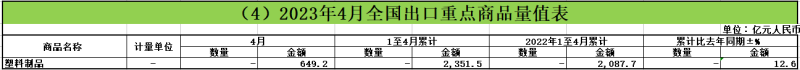 塑料制品:2023年4月,塑料制品出口金额为649.2亿元;1-4月累计出口金额为2,351.5亿元(2022年1-4月累计出口金额为2,087.7亿元),累计比去年同期增长12.6%。