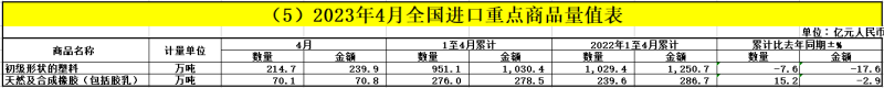 天然及合成橡胶(包括胶乳):2023年4月,天然及合成橡胶(包括胶乳)进口数量为70.1万吨,进口金额为70.8亿元;1-4月累计进口数量为276万吨,累计进口金额为278.5亿元(2022年1-4月累计进口数量为239.6万吨,累计进口金额为286.7亿元);累计进口数量比去年同期增长15.2%,累计进口金额比去年同期下降2.9%。
