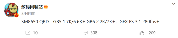 来自@数码闲聊站 爆料的消息,SM8650 QRD(即骁龙8 Gen 3)在GeekBench5的单核成绩为1700分左右,多核成绩为6600分左右,在GeekBench6的单核成绩约为2200分,多核成绩约为7000分。