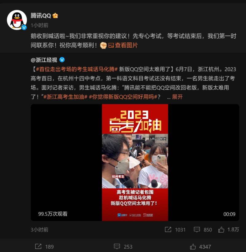 今日上午 2023 年高考语文考试结束后,首位出考场的考生面对媒体采访时向马化腾喊话:“腾讯能把 QQ 空间改回老版本吗?新版本太难用了。”这番言论在微博及空间上引起热议,也一度冲上微博热榜。