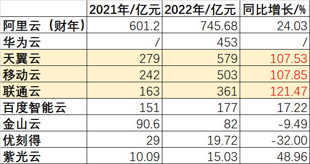 云厂商2021与2022年营收同比增长数据表