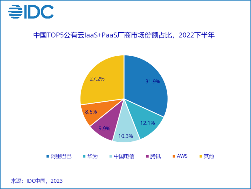 云厂商都处在同一片公有云市场下,可以观察到现在公有云市场的增速已经开始放缓。据IDC《中国公有云服务市场(2022下半年)跟踪》报告显示,2022年下半年中国公有云服务整体市场规模(IaaS/PaaS/SaaS)为188.4亿美元,其中IaaS+PaaS市场在2022下半年同比增长19.0%,与2021年下半年增速相比下滑幅度达到23.9%,与2022上半年相比下滑11.6%。