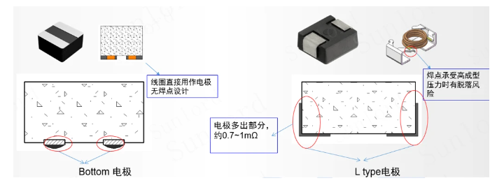 L type电感产品侧面有一段电极,电阻约0.7~1mΩ,相对而言WT Bottom电感,电阻会小1.4~2mΩ。
