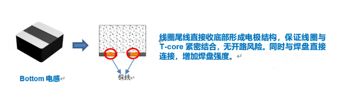 顺络WT系列模塑一体成型电感采用的是Bottom结构。产品线圈引出后尾线经过产品