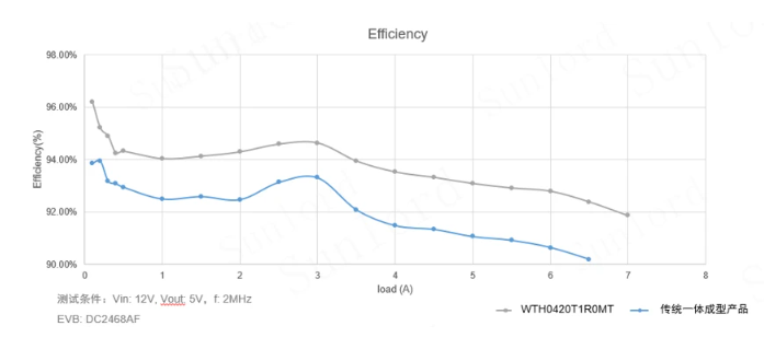 相比于传统一体成型电感,在高负载时,WT系列电感转换效率可提高将近2%。