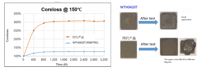 高温负载3200H试验后,WT系列产品损耗增加幅度在50%以内,并且产品外观良好;同行样品损耗增加幅度超过300%,产品大面积磁粉脱落。