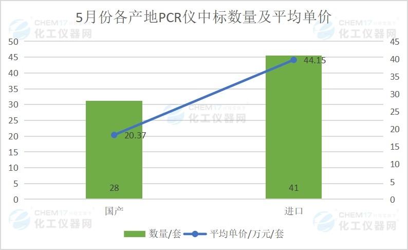 根据5月份各产地PCR仪中标数量及平均单价统计,5月份国产PCR仪中标28台/套,平均单价20.37万,占中标总数量的40.58%;进口PCR仪中标41台/套,平均单价44.15万,占中标总数量的59.42%。