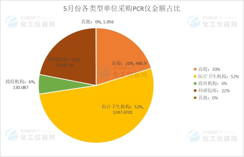 从中标数量来看,5月采购PCR仪最多的单位是医疗卫生机构,共采购31台/套,平均单价40.24万元;科研院所采购数量为20台/套,平均单价26.05万;高校采购数量为10台/套,平均单价48.09万;政府机构采购数量为7台/套,平均单价18.58万;其他单位采购数量1台/套,单价1.056万。