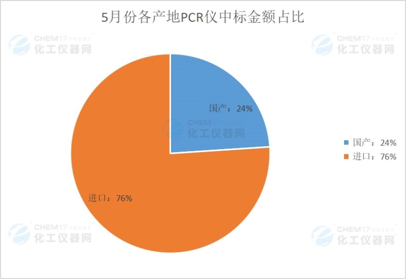 根据5月份各产地PCR仪中标金额占比统计,5月份国产PCR仪中标金额总计570.3219万,约占5月份PCR仪整体中标金额24%;5月份进口PCR仪中标金额总计1810.1151万,约占5月份PCR仪整体中标金额76%。