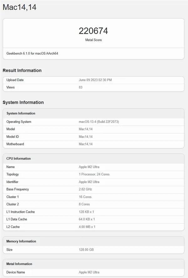 经查,运行M2 Ultra的Mac Studio(Mac14,14)现身Geekbench 5.4跑分库。