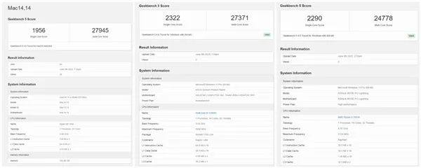 芯片识别为24核3.68GHz,192GB内存,最终单核1956分,多核27945分,比M Ultra提升了18%。