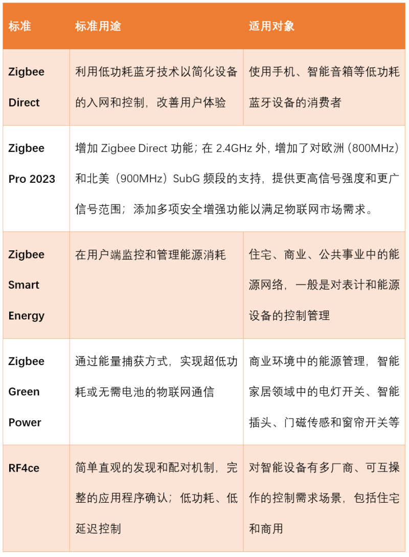 根据CSA联盟官网信息,目前围绕Zigbee主要产生5类技术或解决方案,分别为Matter、Zigbee全栈解决方案(最新版本为Zigbee Pro 2023)、Green Power、Smart Energy、Rf4ce。