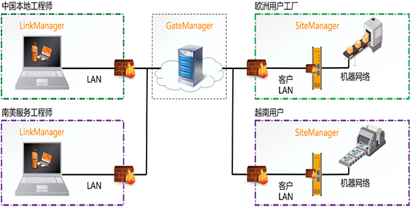 设备数字化的另一个基本能力则是远程的诊断与维护技术(图2),贝加莱通过安装于本地的Link Manager经由在云端架构的服务器(GateManager),可以连接现场的机器(SiteManager)。其实,我们可以通过各种云(阿里云、华为云、亚马逊AWS、微软Azure等)来进行远程的数据访问-建立安全的连接通道,这确保数据与程序的安全。