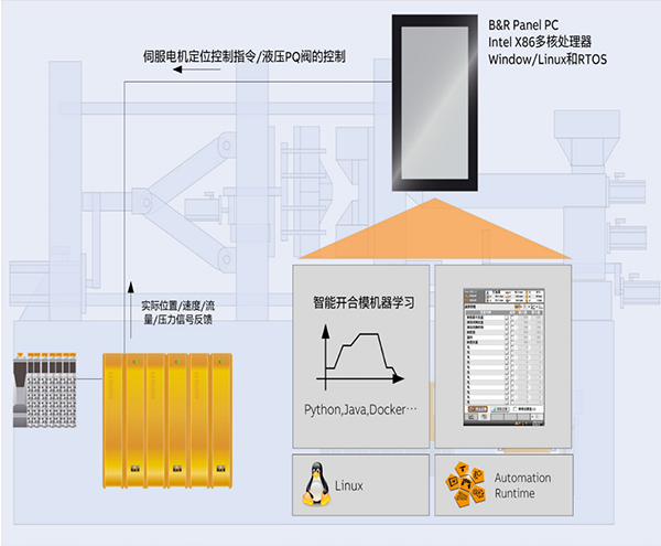 贝加莱的控制系统具有算法设计能力,不仅是基于高级语言的算法设计能力,也可以基于学习模式来进行参数学习,通过对多次的师傅的经验学习,机器可以获得自己的最佳参数收敛,并且,它是一个不断迭代的系统。在硬件上,它依赖于高性能计算的Panel PC的Hypervisor能力,可以运行Windows/Linux系统,在软件上可以通过C/C++或通过exOS来实现Linux下训练模型与机器的交互(图4)。