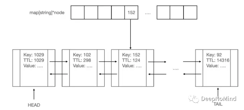基于这两种数据结构可以同时提供键值特性和LRU策略。参考以上设计概念图,hash-map的键将是字符串键,值是指向链表节点的指针,节点将保存键的值。