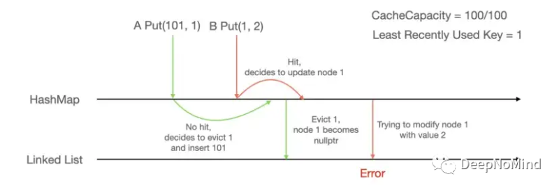 在该设计中,存在两种不同的数据结构,并且并不总是同步的。在执行过程中,hash-map的修改和链表的修改之间有一个微小的时间间隔,请看下面的例子。