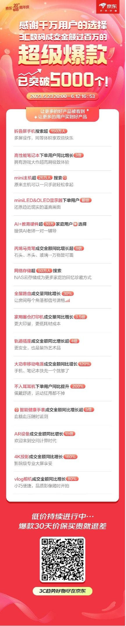 值得一提的是,包括折叠屏手机、mini主机、AR设备、投影仪在内的各3C数码趋势品类产品也在今年京东618期间迎来全面增长。这些引领潮流的3C数码产品为消费者提供了更好的生活体验,从而收获更多消费者的关注、购买和自发安利。