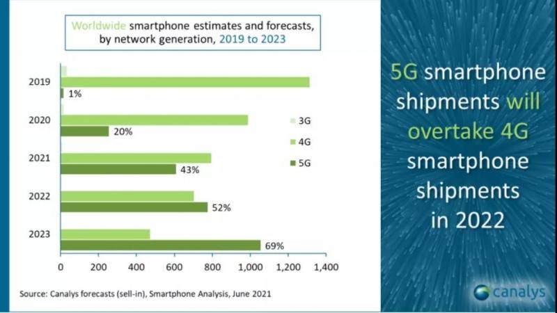 市调机构Canalys近日发布最新预测,2021年全球智能手机市场将增长12%,出货量将达14亿台,其中5G手机占比将达43%,这一数字在2022年将提高至52%,同时意味着5G手机出货量首次超过4G手机。