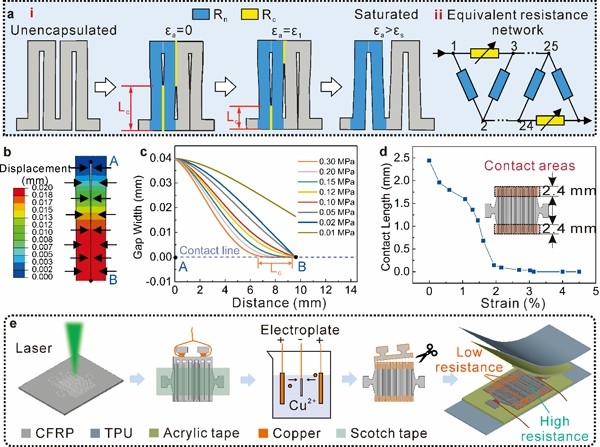 图1.柔性应变传感器的设计和制备。a、蛇形曲流结构的传感机制;b、传感单元在表面切应力作用下的位移云图;c、传感单元在不同表面切应力作用下相邻曲流条纹的间隙沿传感器宽度方向分布曲线;d、相邻曲流条纹的接触区域长度随应变的变化曲线;e、传感器制备流程示意图。