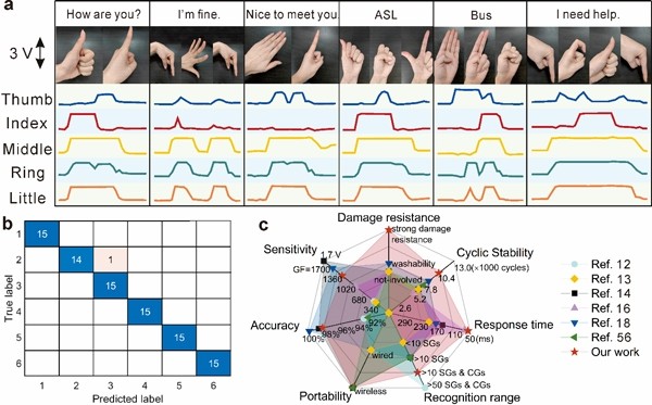 图5.手语识别验证。a、6种由复合手势组成的手语;b、手语翻译系统对6种手语的识别准确率;e、手语翻译系统的各项性能汇总。