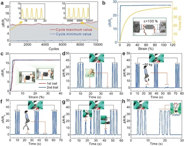 图3.柔性应变传感器的机械鲁棒性。a、循环稳定性;b、最大可承受应变;c-e:对严苛环境的耐受力。