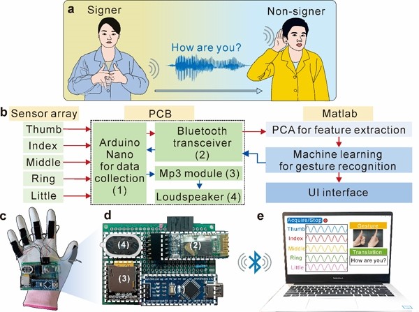 图4.可穿戴手语翻译系统。a、应用场景示意图;b、系统框架;c、手语手套;d、无线电路板;e、用户界面。