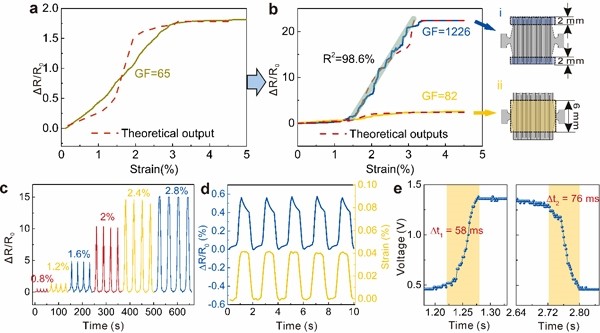 图2.柔性应变传感器的传感性能。a、高/低电阻区调控前的响应曲线;b、高/低电阻区调控后的响应曲线;c、在不同峰值应变下的循环响应曲线,极限检测应变;d、响应和回复时间。