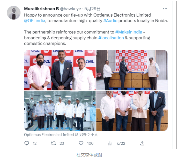 小米印度公司总裁穆拉里什南(Murali Krishnan B)在推特上表示,很高兴宣布小米与Optiemus Electronics Limited的合作,这一伙伴关系加强了小米对“印度制造”的承诺——扩大和深化供应链本地化,支持印度国内领军企业。