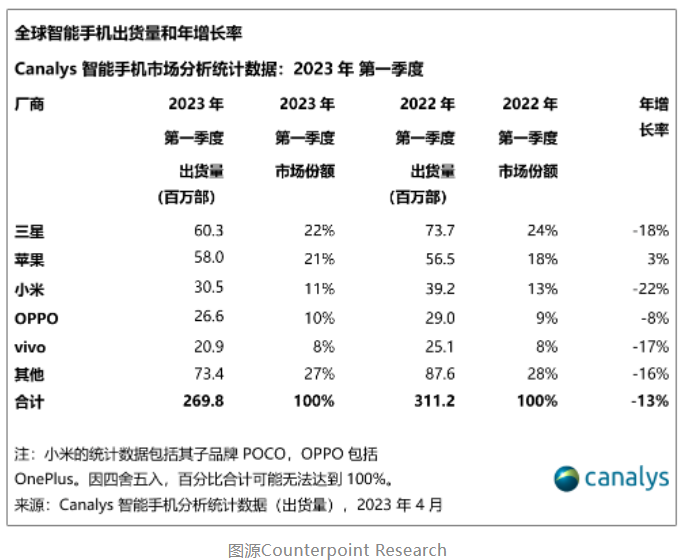 市场调研机构Canalys数据显示,2023年第一季度,全球智能手机出货量下降13%,跌至2.70亿部。虽然小米以3050万部的出货量捍卫了其第三名的位置,但出货量同比大幅下滑22%。