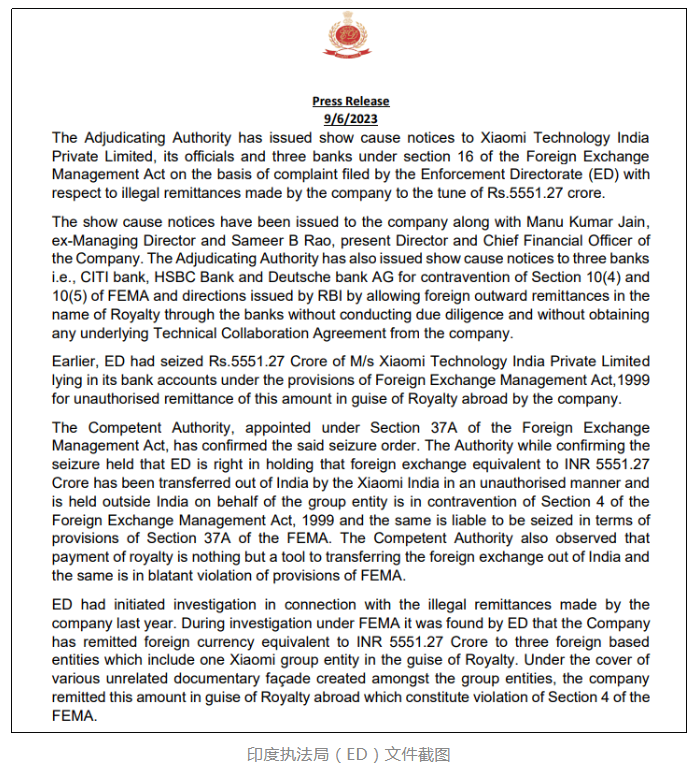 印度执法局(ED)6月9日发布文件称,因小米涉嫌违反该国《外汇管理法》(FEMA),“向外国实体非法转移资金”,该局已经向小米技术印度私人有限公司、小米印度分公司、部分高管及花旗等三家银行发出正式通知。