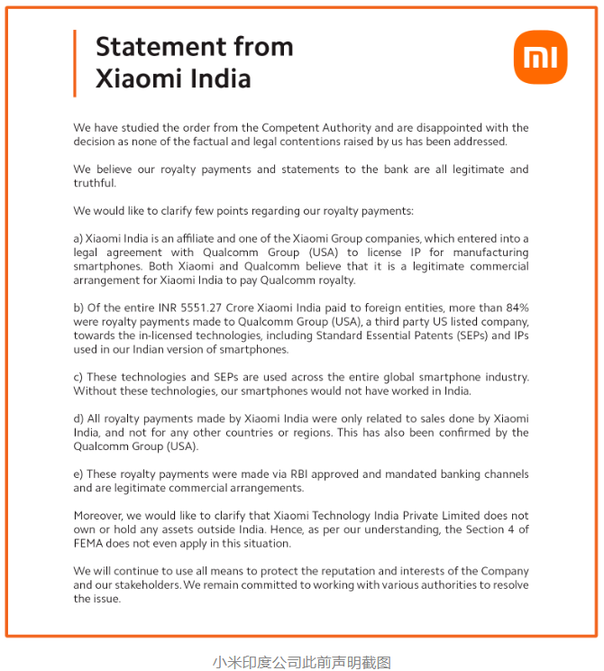 小米印度公司表示,高通方面可以证实,这些费用只和在印度销售的手机有关,不涉及其他国家和地区;该款项是通过获批准和授权的银行支付的,是合法的商业行为;此外,小米科技印度私人有限公司在印度境外不拥有或持有任何资产。