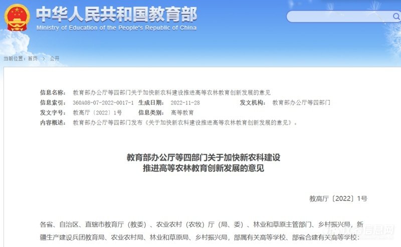 2022年,教育部办公厅等四部门发布《关于加快新农科建设推进高等农林教育创新发展的意见》,特别强调大力推进农林类紧缺专业人才培养,着力提升农林专业生源质量。将生物育种纳入基础学科招生改革试点,将生物育种、农林智能装备相关学科专业纳入有关专项计划支持范围。