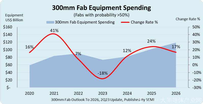 美国加州时间2023年6月13日,SEMI在《300mm晶圆厂展望报告-至2026年》(300mm Fab Outlook Report to 2026)中强调,继2023年的下降之后,从明年开始全球前端的300mm晶圆厂设备支出将开始恢复增长,预计2026年将达到1190亿美元的历史新高。对高性能计算、汽车应用的强劲需求和对存储器需求的提升将推动支出增长。
