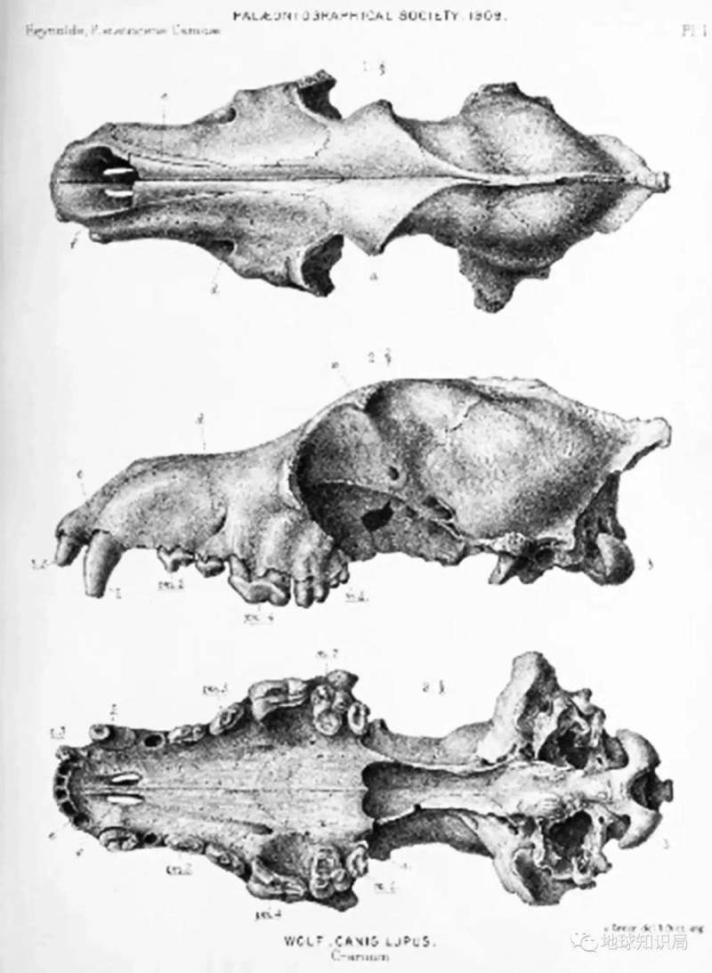 更新世狼与大型现代灰狼相当,但它拥有更短、更宽的上颚和更大的牙齿,使其能够捕食更新世的巨型动物(更新世狼头盖骨的插图,图:wiki)▼