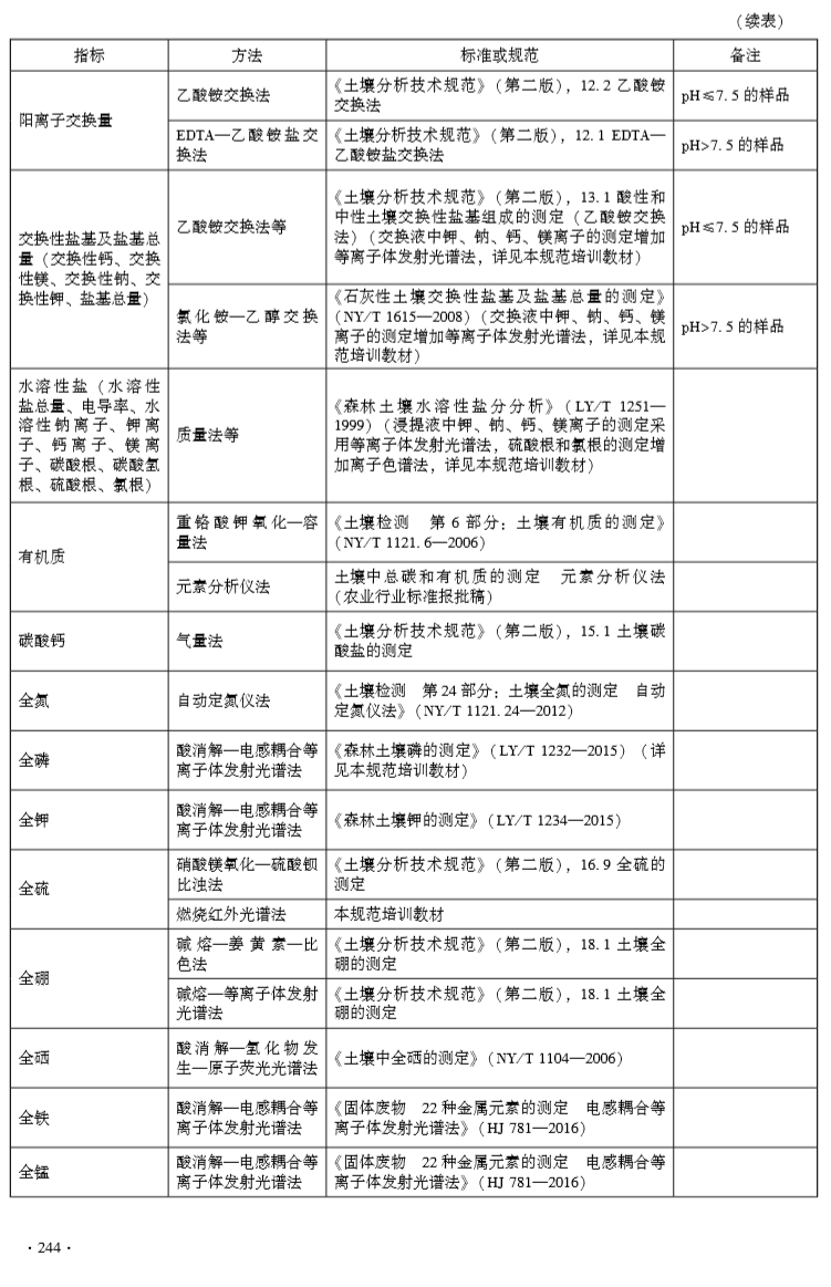 答:《第三次全国土壤普查土壤样品制备与检测技术规范(修订版)》规定土壤中交换性盐基总量和交换性盐基的检测方法,对于pH≤7.5的样品,采用《土壤分析技术规范》(第二版),13.1酸性和中性土壤交换性盐基组成的测定(乙酸铵交换法)方法测定;对于pH>7.5的样品,采用《石灰性土壤交换性盐基及盐基总量的测定》(NY/T 1615-2008)方法测定。