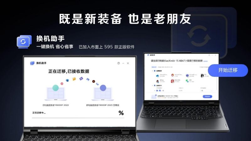 如果担心老爸换机不会数据同步,不如尝试联想天禧生态的“一键换机”功能。使用联想电脑管家中的“换机助手”,简单选择后就能将旧设备中的数据转移到新电脑。得益于595款正版软件的覆盖,联想一键换机功能基本能实现数据的完整转移,带来无缝的设备升级体验。