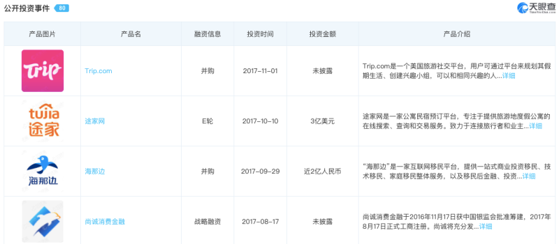 2014年,携程就开始触及海外服务商,几年辗转间通过收购、合作等方式,获取了站式平台Trip.com、垂直搜索平台Skyscanner等海外站点资源。即便2016年,梁建章辞任、孙洁接手后,海外市场仍旧是携程的重点战略方向。通过天眼查App,也可以窥探到当年携程的海外战略投资。