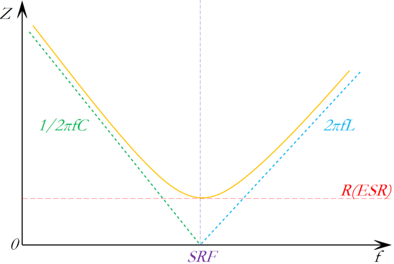 - 谐振频率(2πfL = 1/(2πfC))下,阻抗是由ESR来决定,在自谐振频率处,电路是纯阻性的,ESR成为阻抗的最小值*。*