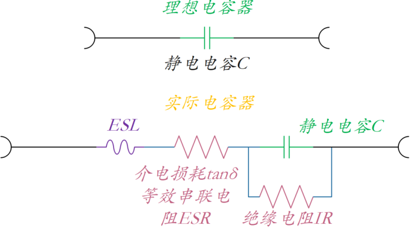理想的电容器只含有静电电容成分,但是实际的电容器则含有电阻成分和电感成分。这些寄生成分对电容器的性能产生较大的影响。电容器的简易等效电路如图1-2所示。实际的电容器的等效电路中包含有ESR(等效串联电阻)、ESL(等效串联电感)。此外,理想的电容器的电极间是绝缘的,但是实际上会存在若干的漏电流。