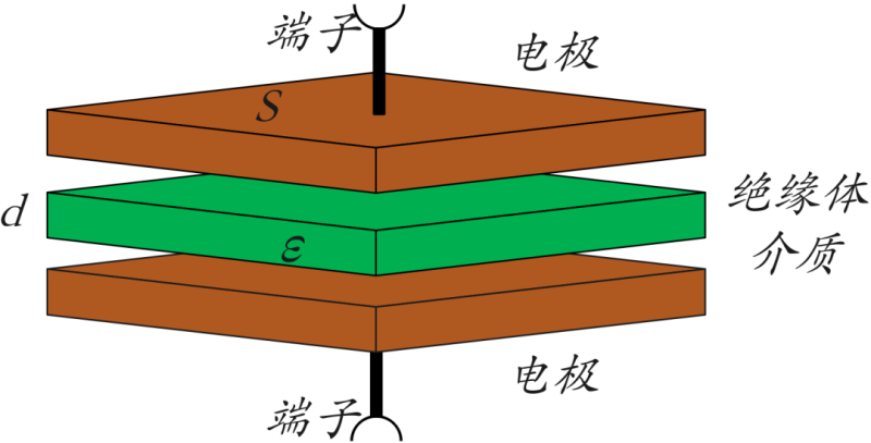 这里列出电容器的结构示意 图1-1 。将绝缘体(电介质)平行地夹在金属板(电极)之间而构成的就是电容器。如果向该金属板(电极)间施加直流电压,就可将电荷蓄积起来。这就是电容器的蓄电原理。被蓄积起来的电荷量叫做静电电容,静电电容C是由绝缘体的介电常数ε、电极的表面积S、绝缘体的厚度d来决定的。
