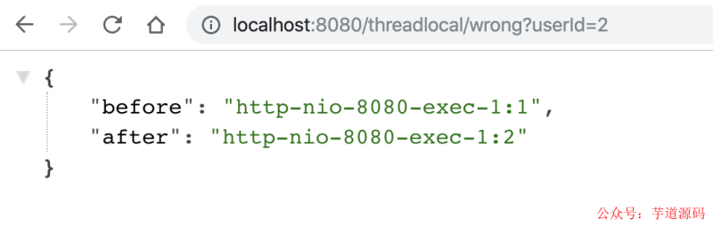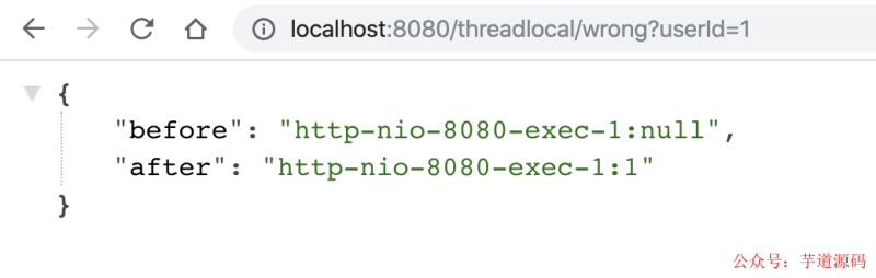 privatestaticfinalThreadLocalcurrentUser=ThreadLocal.withInitial(()->null); @GetMapping("wrong") publicMapwrong(@RequestParam("userId")IntegeruserId){ //设置用户信息之前先查询一次ThreadLocal中的用户信息 Stringbefore=Thread.currentThread().getName()+":"+currentUser.get(); //设置用户信息到ThreadLocal currentUser.set(userId); //设置用户信息之后再查询一次ThreadLocal中的用户信息 Stringafter=Thread.currentThread().getName()+":"+currentUser.get(); //汇总输出两次查询结果 Mapresult=newHashMap(); result.put("before",before); result.put("after",after); returnresult; }