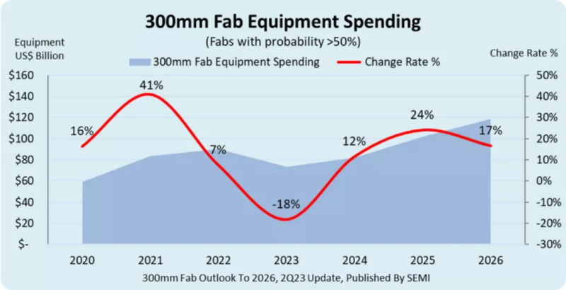 在今年预计下降 18% 至 740 亿美元之后,全球 300 毫米晶圆厂设备支出预计将在 2024 年增长 12% 至 820 亿美元,在 2025 年增长 24% 至 1019 亿美元,在 2026 年增长 17% 至 1188 亿美元。