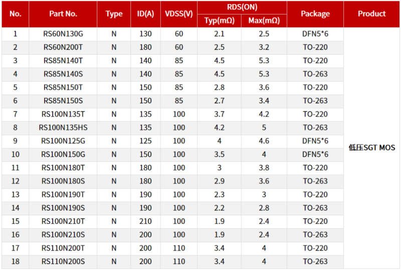 瑞森半导体在电动两轮车上主推低压SGT MOS系列,推荐如下产品选型表: