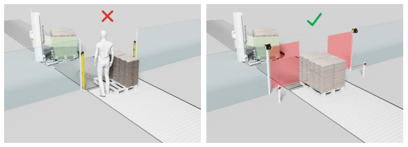 在内部物流场景中,不同的货物宽度或位置对输送线上的通道防护提出了特殊的挑战,货物的动态变化成为了潜在的安全风险,原因在于:如果货物在托盘上的宽度、位置,或托盘在输送机上的位置发生变化,货物旁边就会出现不受监控的缝隙。此时,操作员容易误入危险区域而发生事故。