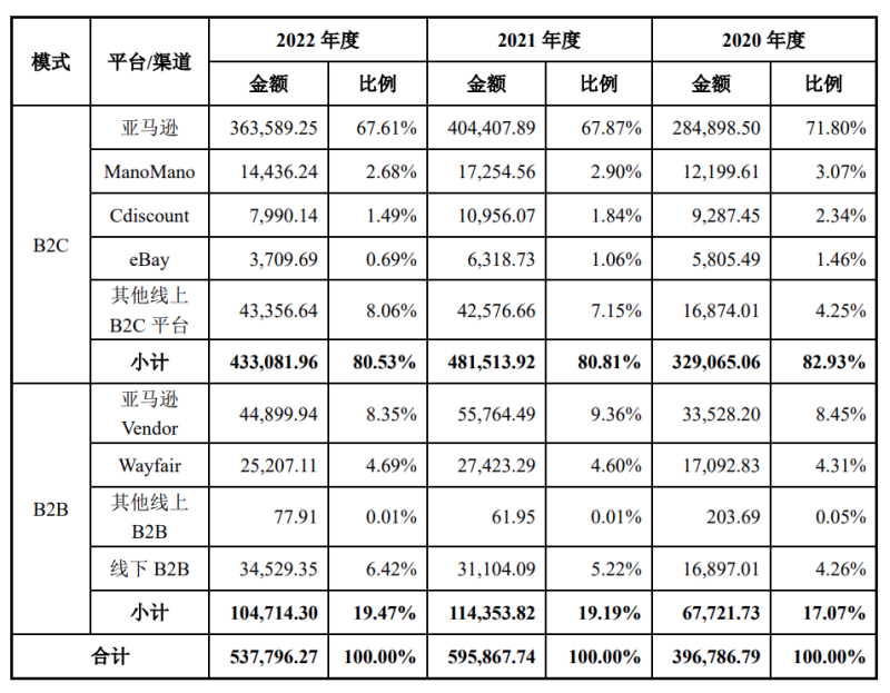 报告期内,公司线上B2C渠道实现的销售收入分别为32.91亿元、48.15亿元和43.31亿元,占主营业务收入的比例分别为82.93%、80.81%和80.53%;海外销售平台包括亚马逊、Cdiscount、ManoMano、eBay等。