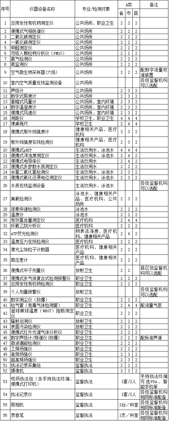 2.上述省、市、县级卫生健康监督执法现场检测数量为达标要求,服务人口多、现场检测任务较重的省、市、县级疾控中心,可依据需要增加设备数量。