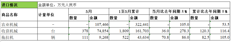 收获机械方面:进口数量为378台,进口金额为74,854万元;当月进口数量比去年同期增长36%,当月进口金额比去年同期增长278.3%;1至5月累计进口数量为1809台,累计进口金额为161,703万元;累计进口数量比去年同期增长120.3%,累计进口金额比去年同期增长116.4%。