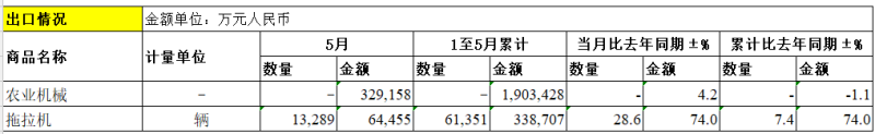 拖拉机方面:出口数量为13289辆,出口金额为64,455万元;当月出口数量比去年同期增长28.6%,当月出口金额比去年同期增长74%;1至5月累计出口数量为61351辆,累计出口金额为338,707万元;累计出口数量比去年同期增长7.4%,累计出口金额比去年同期增长74%。