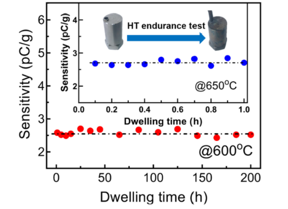 当前,航空航天、核电能源等工业领域对高温压电材料及传感器件提出了更高的要求。然而目前能够用于高温环境下的压电振动传感器,特别是工作温度高于482oC的压电振动传感器,品种稀少且长期“受制于美”。为开发实用型高温压电晶体与传感器件,研究团队从低成本的Ba2TiSi2O8晶体中设计出一种具有线性热膨胀、高压电活性和低串扰的压电灵敏元件,解决了超宽温域范围内压电响应的温漂问题。利用该元件研制了压缩式压电振动传感器,通过预紧力优化提高的器件整体传感性能,在室温到650oC温度范围内,灵敏度高于2.5pC/g,最大温漂仅为1.8%,优于目前国内外同类型器件技术水平。